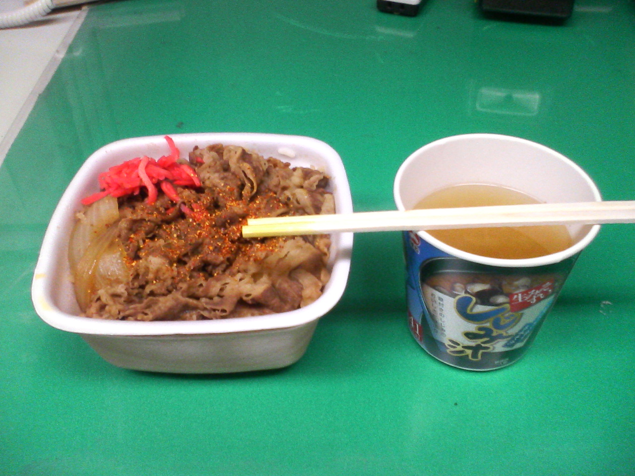 吉牛&しじみ汁、そして手に持ってた為に写らなかった黒烏龍茶です。